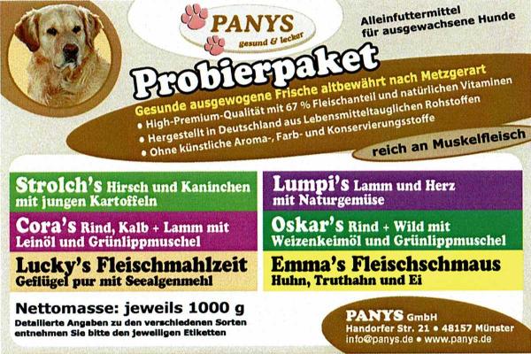 Lassen Sie Ihren Hund diese köstlichen und ernährungsphysiologisch ausgewogenen Menüs einmal probieren. Unser Probierset der Hundefeuchtnahrung im Pouchbeutel gibt es in 100 g und 300 g. Mit dem Schnupperpaket hat Ihr Hund die Möglichkeit, alle 12 Geschmacksrichtungen unserer erlesenen Mahlzeiten, einmal zu probieren. Natürlich kann auch jede Sorte die der Hund bevorzugt, einzeln im 12er Pack bestellt werden.